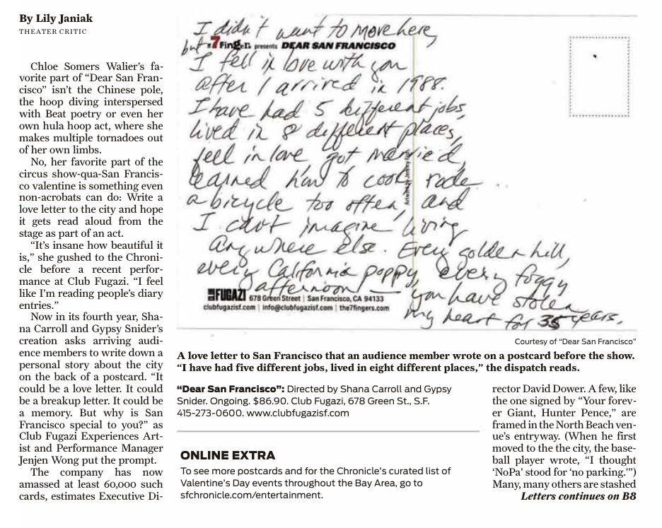 No, her favorite part of the circus show-qua-San Francisco Valentine is something even non-acrobats can do: Write a love letter to the city and hope